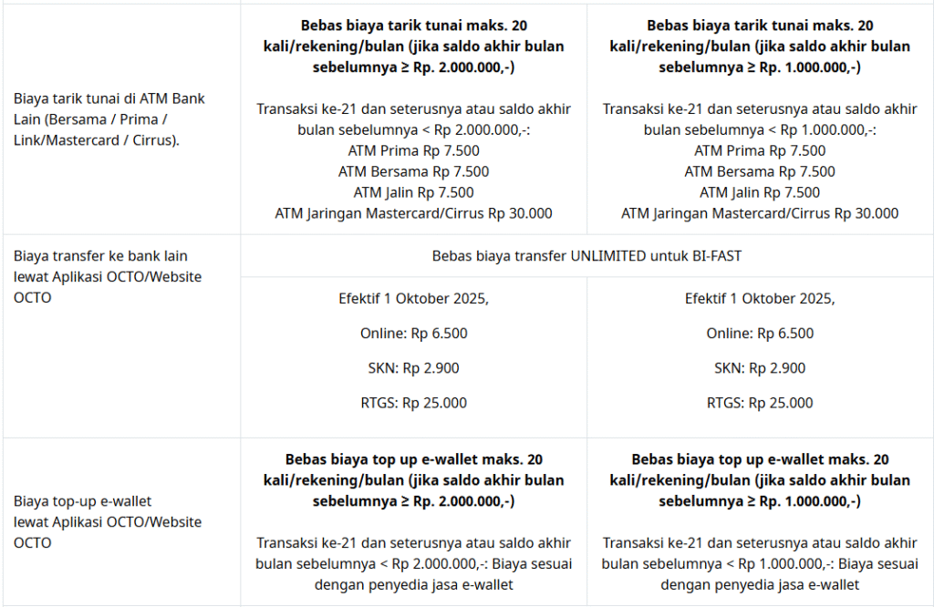 Bank ini mempunyai 1 tabungan yang benama rekening Octo Savers + Plus, Dimana kamu akan mendapatkan 20x gratis tarik tunai disemua atam seluruh jagat indonesia ini. Dengan syarat minimal salso tersisa setelah penarikan adalah tidak kurang dari Rp 2 Juta rupiah. Jangan Lupa untuk memakai kartu debit GPN agar kamu gratis admin bulanan untuk pemakaian kartu Debit ATM GPN. Kalo kamu pilih Mastercard dia akan berbayar.
